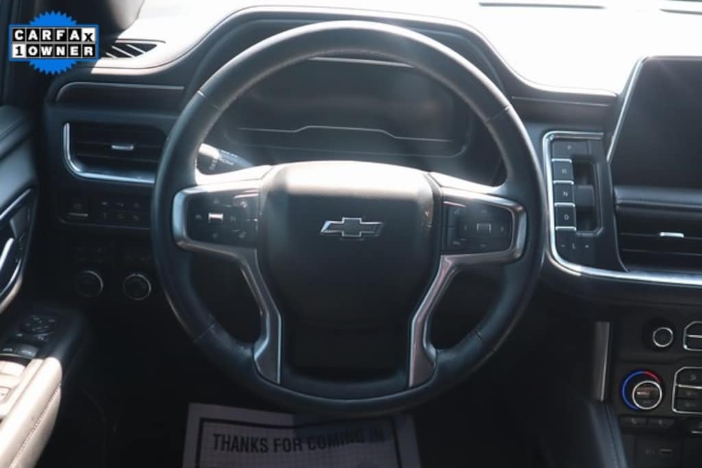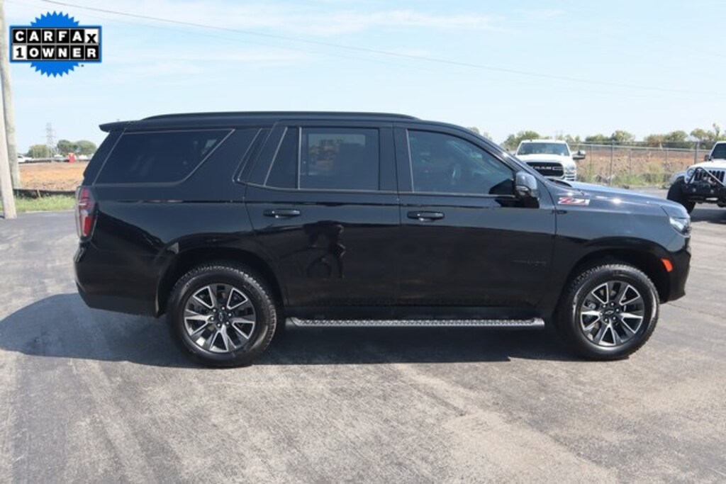 Black 2023 Chevrolet Tahoe Z71 4WD 10-Speed Automatic with Overdrive EcoTec3 5.3L V8 4WD, Black Leather, 1st & 2nd Row Color-Keyed Carpeted Floor Mats, 2-Speed Active Electronic AutoTrac Transfer Case, 2nd Row Pwr Release 60/40 Split-Folding Bench Seat, 3.23 Rear Axle Ratio, 3rd Row 60/40 Power-Folding Split-Bench Seat, Apple CarPlay/Android Auto, Auto High-beam Headlights, Auto-Dimming Inside Rear-View Mirror, Auto-dimming Rear-View mirror, Automatic temperature control, Black Tubular Assist Steps, Bose 9-Speaker Stereo Audio System Feature, Brake assist, Bright Front & Rear Door Sill Plates, Bumpers: body-color, Color-Keyed Carpeting Floor Covering, Compass, Driver & Front Outboard Passenger Airbags, Driver Alert Package, Driver door bin, Driver vanity mirror, Dual-Pane Power Panoramic Sunroof, Electronic Stability Control, Enhanced Driver Information Center, Floor Console, Floor Console w/Storage Area, Four wheel independent suspension, Front dual zone A/C, Front High-Approach Angle Fascia, Front reading lights, Fully automatic headlights, Garage door transmitter, Hands-Free Rear Power Programmable Liftgate, HD Surround Vision, Heated 2nd Row Outboard Seats, Heated door mirrors, Heated Driver & Front Passenger Seats, Heated Steering Wheel, Hill Descent Control, Illuminated entry, Infotainment Display, Lane Change Alert w/Side Blind Zone Alert, Leather-Appointed Seat Trim, LED Daytime Running Lamps, Low tire pressure warning, Luxury Package, Memory seat, Memory Settings, Memory Settings for Driver, Navigation System, Outside Heated Power-Adjustable Mirrors, Outside temperature display, Overhead console, Panic alarm, Passenger door bin, Passenger vanity mirror, Power door mirrors, Power driver seat, Power Liftgate, Power passenger seat, Power steering, Power Tilt & Telescopic Steering Column, Power windows, Preferred Equipment Group 2Z7, Premium audio system: Chevrolet Infotainment 3 Premium, Premium Smooth Ride Suspension, Radio: Chevrolet Infotainment 3 Premium System, Rain sensing wipers, Rear air conditioning, Rear Cross Traffic Alert, Rear Pedestrian Alert, Rear reading lights, Rear seat center armrest, Rear window defroster, Rear window wiper, Red Horizontal-Mounted Recovery Hooks, Remote keyless entry, Remote Start, Security system, SiriusXM Radio w/360L, Speed control, Speed-sensing steering, Spoiler, Steering wheel mounted audio controls, Tachometer, Telescoping steering wheel, Tilt steering wheel, Traction control, Trip computer, Universal Home Remote, Variably intermittent wipers, Voltmeter, Wheels: 20" x 9" Machined Aluminum, Wireless Charging, Wrapped Steering Wheel.