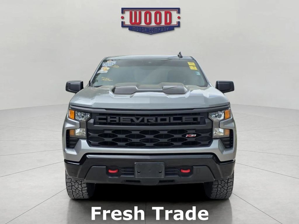 CARFAX One-Owner. Clean CARFAX. Silverado 1500 Custom Trail Boss, 4D Crew Cab, 2.7L I4 Turbocharged DOHC 16V LEV3-SULEV30 310hp, 8-Speed Automatic, 4WD, Sterling Gray Metallic, Jet Black w/Cloth Seat Trim, 10-Way Power Driver Seat w/Lumbar, 120-Volt Bed Mounted Power Outlet, 120-Volt Interior Power Outlet, 3.5" Monochromatic Display Driver Info Center, 40/20/40 Front Split-Bench Seat, Auto High-beam Headlights, Auto-Locking Rear Differential, Bluetooth® For Phone, Chevrolet Connected Access Capable, Color-Keyed Carpeting Floor Covering, Custom Convenience Package, Deep-Tinted Glass, Dual Rear USB Ports (Charge Only), Electric Rear-Window Defogger, Electrical Steering Column Lock, Electronic Cruise Control, Electronic Stability Control, EZ Lift Power Lock & Release Tailgate, Front Rubberized Vinyl Floor Mats, Fully automatic headlights, HD Rear Vision Camera, Hill Descent Control, Hitch Guidance, LED Cargo Area Lighting, Manual Tilt Wheel Steering Column, OnStar & Chevrolet Connected Services Capable, Outside temperature display, Performance Red Recovery Hooks, Power driver seat, Power Front Windows w/Driver Express Up/Down, Power Front Windows w/Passenger Express Down, Power Rear Windows w/Express Down, Power windows, Preferred Equipment Group 2CX, Premium audio system: Chevrolet Infotainment 3, Rear 60/40 Folding Bench Seat (Folds Up), Rear Rubberized-Vinyl Floor Mats, Remote Keyless Entry, Remote keyless entry, Remote Vehicle Starter System, SiriusXM Radio, Standard Tailgate, Theft Deterrent System (Unauthorized Entry), Traction control, Trailering Package, Wi-Fi Hot Spot Capable. Sterling Gray Metallic 2024 Chevrolet Silverado 1500 Custom Trail Boss 4WD 8-Speed Automatic 2.7L I4 Turbocharged DOHC 16V LEV3-SULEV30 310hp