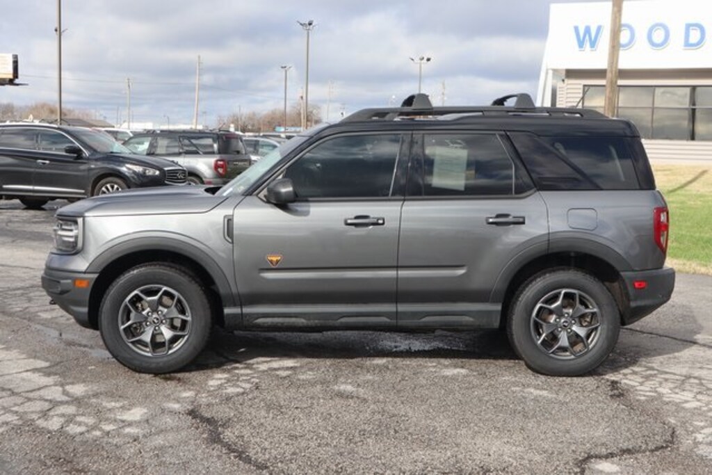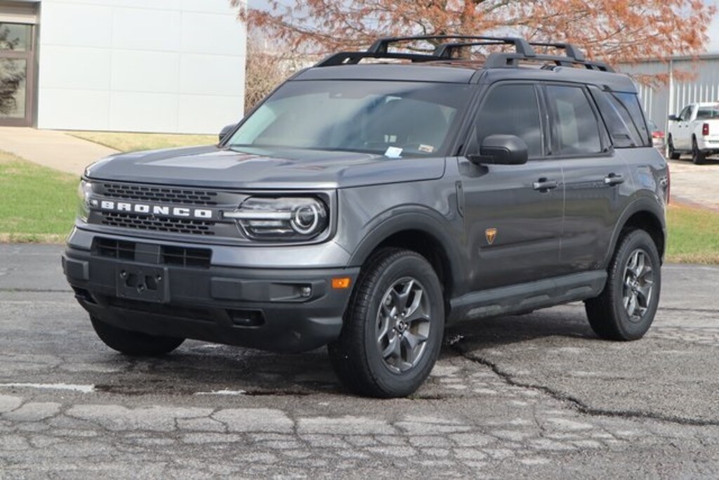 Gray Metallic 2021 Ford Bronco Sport Badlands 4WD 8-Speed Automatic EcoBoost 2.0L I4 GTDi DOHC Turbocharged VCT 3.80 Axle Ratio, Auto High-beam Headlights, Auto-Dimming Rear-View Mirror, Badlands Package, Body-Colored Door Handles, Brake assist, Class II Trailer Tow Package w/Trailer Sway Control, Compass, Driver door bin, Driver vanity mirror, Dual-Zone Electronic Automatic Temperature Control, Electronic Stability Control, Equipment Group 400A, Evasive Steering Assist, Exterior Parking Camera Rear, Ford Co-Pilot360 Assist+, Front & Rear Floor Liners w/Carpet Mats, Front Bucket Seats, Front Center Armrest, Front fog lights, Front License Plate Bracket, Front reading lights, Fully automatic headlights, HD Radio, Heated front seats, Heated Leather-Wrapped Steering Wheel, Illuminated entry, Intelligent Adaptive Cruise Control w/Stop & Go, Leather Trimmed Heated Sport Contour Bucket Seats, Low tire pressure warning, Occupant sensing airbag, Outside temperature display, Overhead airbag, Overhead console, Panic alarm, Passenger door bin, Passenger vanity mirror, Power driver seat, Power Moonroof, Power steering, Power windows, Rear reading lights, Rear seat center armrest, Rear window wiper, Remote keyless entry, Remote Start System, Reverse Sensing System, Roof rack: rails only, Security system, Speed-sensing steering, Speed-Sensitive Wipers, Split folding rear seat, Steering wheel mounted audio controls, SYNC 3/Apple CarPlay/Android Auto, Tachometer, Telescoping steering wheel, Tilt steering wheel, Trip computer, Unique Cloth Heated Sport Contour Bucket Seats, Variably intermittent wipers, Voice-Activated Touchscreen Navigation System, Wheels: 17" Carbonized Gray-Painted Aluminum, Wireless Charging Pad.
