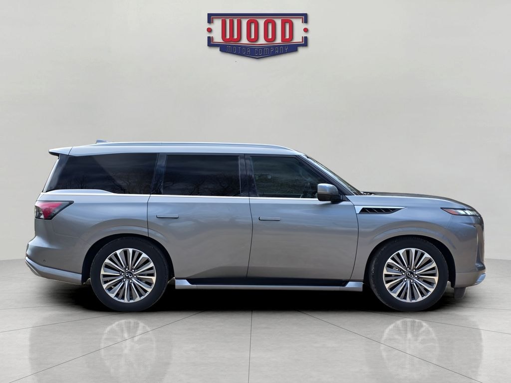 CARFAX One-Owner. QX80 Sensory, 4D Sport Utility, 3.5L V6 DOHC 24V, 9-Speed Automatic, 4WD, Dynamic Metal, Sepia Brown w/Semi-Aniline Premium Leather Seating Surfaces, 3rd row seats: bench, Apple CarPlay/Android Auto, Automatic temperature control, Electronic Stability Control, Front Bucket Seats, Front dual zone A/C, Fully automatic headlights, Garage door transmitter: myQ Connected Garage, Heads-Up Display, Heated front seats, Heated rear seats, Heated steering wheel, HVAC memory, Leather steering wheel, Memory seat, Navigation system: Google Built-in, Outside temperature display, Power driver seat, Power Liftgate, Power moonroof, Power windows, ProPILOT Assist 2.1 (SENSORY Grade), Radio: Klipsch Reference Premiere Audio System, Rear air conditioning, Reclining 3rd row seat, Remote keyless entry, Security system, Semi-Aniline Premium Leather Seating Surfaces, Speed control, Steering wheel memory, Steering wheel mounted audio controls, Traction control, Ventilated front seats, Ventilated rear seats, Wheels: 22" x 8" Cast Aluminum Alloy. Dynamic Metal 2025 INFINITI QX80 SENSORY 4WD 9-Speed Automatic 3.5L V6 DOHC 24V