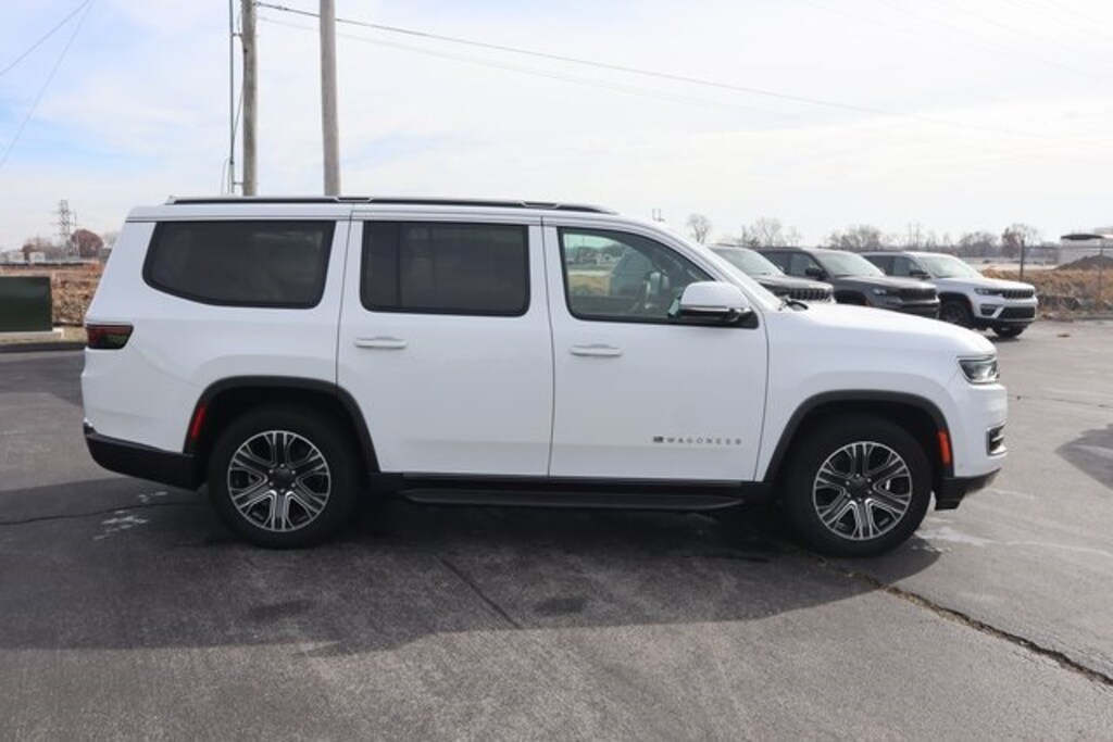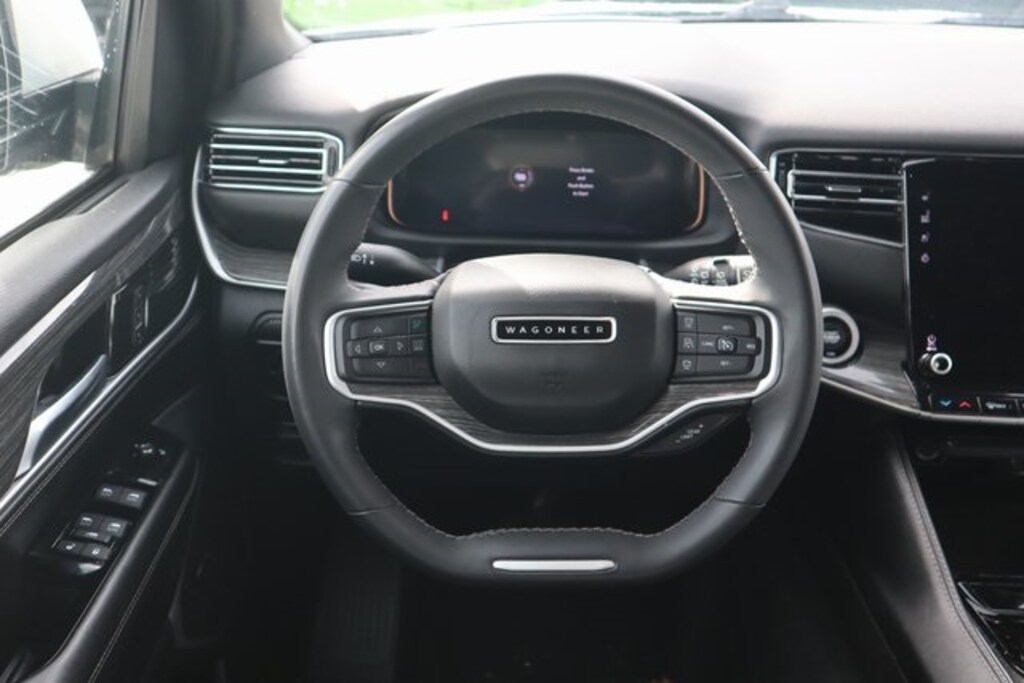 Bright White Clearcoat 2022 Jeep Wagoneer Series III 4WD 8-Speed Automatic 5.7L V8 3.21 Rear Axle Ratio, Adjustable pedals, Air Conditioning, Auto High-beam Headlights, Auto-dimming door mirrors, Auto-dimming Rear-View mirror, Automatic temperature control, Brake assist, Bumpers: body-color, Compass, Delay-off headlights, Driver door bin, Driver vanity mirror, Driver's Seat Mounted Armrest, Electronic Stability Control, Exterior Parking Camera Rear, Front Bucket Seats, Front Center Armrest w/Storage, Front dual zone A/C, Front fog lights, Front reading lights, Fully automatic headlights, Genuine wood console insert, Heads-Up Display, Heated door mirrors, Heated front seats, Heated rear seats, Heated steering wheel, Illuminated entry, Leather Trimmed Bucket Seats, Low tire pressure warning, Memory seat, Navigation System, Outside temperature display, Overhead console, Panic alarm, Passenger door bin, Passenger seat mounted armrest, Passenger vanity mirror, Pedal memory, Power door mirrors, Power driver seat, Power Liftgate, Power passenger seat, Power steering, Power windows, Quick Order Package 22N, Radio: Uconnect 5 Nav w/10.1" Display, Rain sensing wipers, Rear air conditioning, Rear dual zone A/C, Rear reading lights, Rear seat center armrest, Rear window defroster, Rear window wiper, Reclining 3rd row seat, Remote keyless entry, Security system, Speed control, Speed-Sensitive Wipers, Split folding rear seat, Steering wheel memory, Steering wheel mounted audio controls, Tachometer, Telescoping steering wheel, Tilt steering wheel, Trip computer, Turn signal indicator mirrors, Variably intermittent wipers, Ventilated front seats, Voltmeter, Wheels: 20" x 9.0" Premium 2 Aluminum.