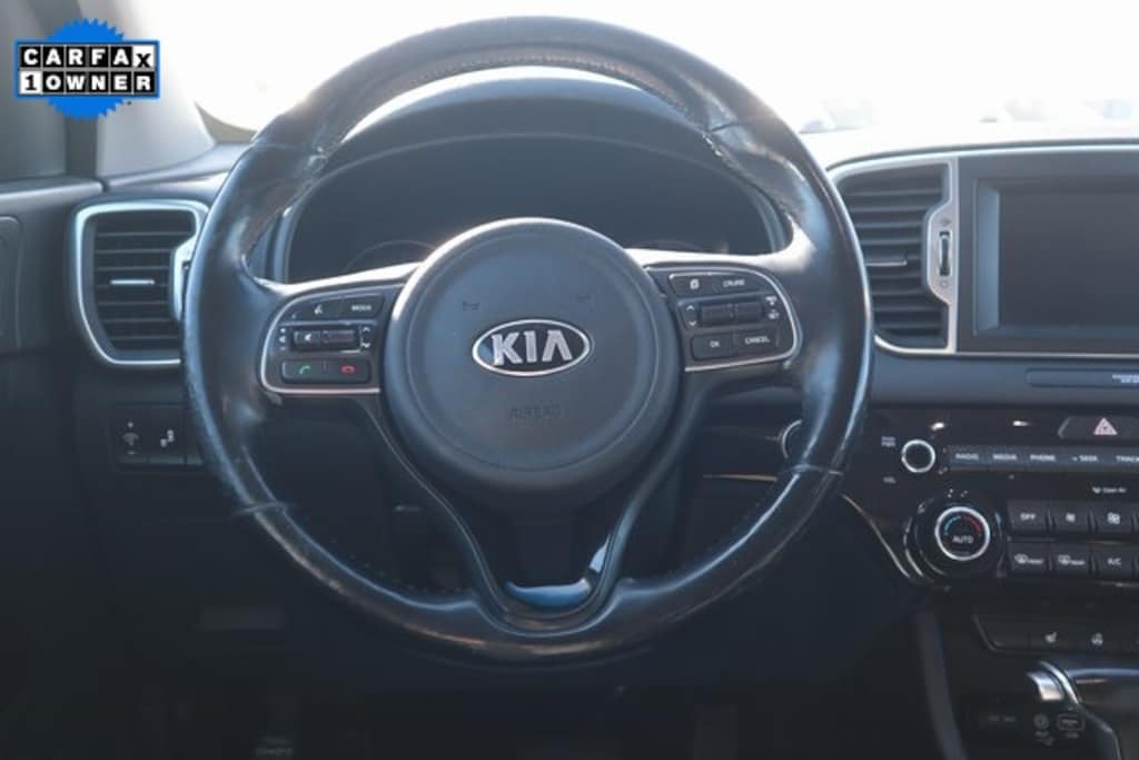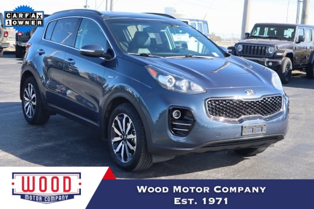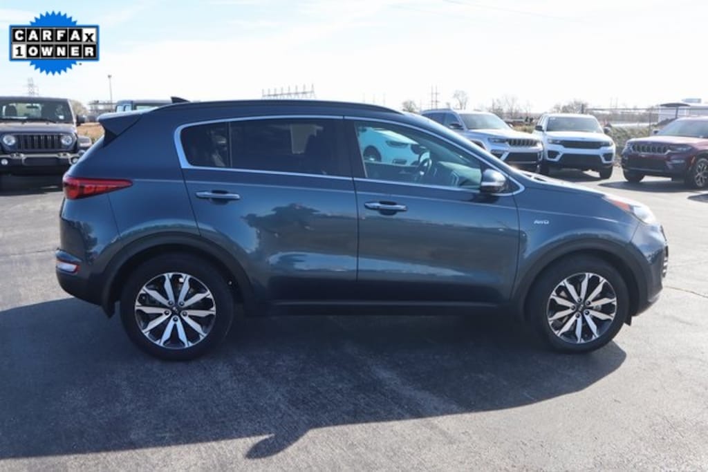 Pacific Blue 2018 Kia Sportage EX AWD 6-Speed Automatic Electronic with Overdrive 2.4L I4 DGI DOHC 16V AWD, 18" Alloy Wheels, 3.20 Axle Ratio, Alloy wheels, Apple CarPlay & Android Auto, Auto-Dimming Rear View Mirror w/HomeLink, Automatic temperature control, Brake assist, Bumpers: body-color, Cargo Mat, Delay-off headlights, Driver door bin, Driver vanity mirror, Electronic Stability Control, EX Premium Package, Exterior Parking Camera Rear, Front Bucket Seats, Front Center Armrest, Front dual zone A/C, Front fog lights, Front reading lights, Fully automatic headlights, Heated door mirrors, Heated Front Bucket Seats, Heated front seats, Heated Steering Wheel, Illuminated entry, Leather Seat Trim, Leather Shift Knob, LED Interior Lighting, Low tire pressure warning, Mud Guards, Outside temperature display, Overhead console, Panic alarm, Panoramic Sunroof, Passenger vanity mirror, Power door mirrors, Power driver seat, Power steering, Power windows, Radio: AM/FM/MP3/SiriusXM, Radio: AM/FM/SiriusXM, Rear seat center armrest, Rear window defroster, Rear window wiper, Remote keyless entry, Roof rack: rails only, Security system, Speed control, Split folding rear seat, Spoiler, Steering wheel mounted audio controls, Tachometer, Telescoping steering wheel, Tilt steering wheel, Trip computer, Turn signal indicator mirrors, Variably intermittent wipers.